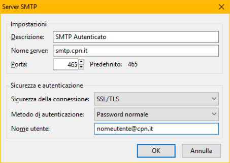 Per configurare l'SMTP autenticato basta inserire i dati dell'account CPN, cioè username@cpn.it, password ed smtp.cpn.it nelle impostazioni del server di posta in uscita.